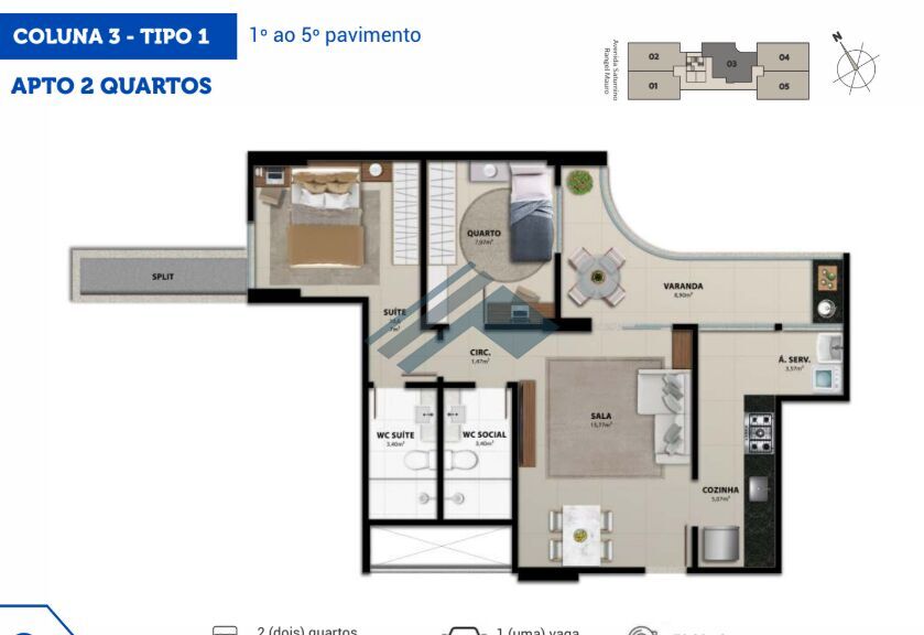 📌 1º ao 5º andar → 5 apartamentos por pavimento (2 quartos, 1 vaga de garagem)